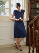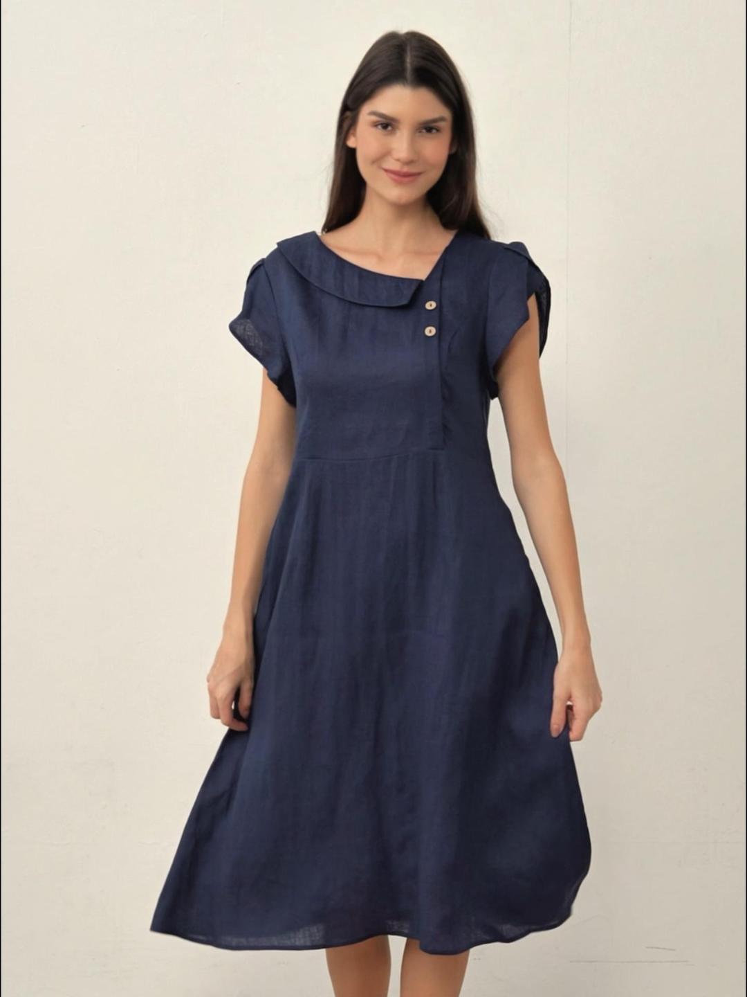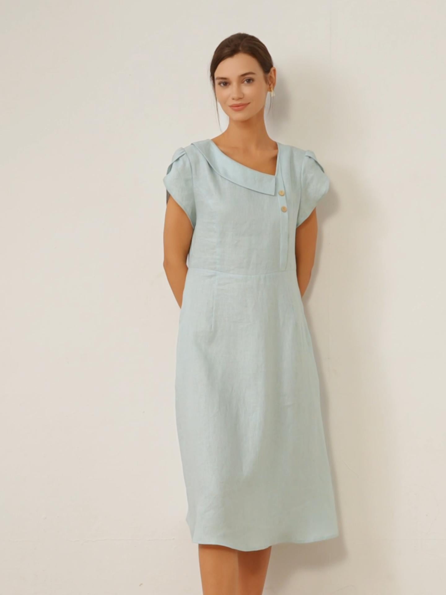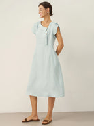 100% Linen Crescent Collar Flutter Sleeve Midi Dress FIONA