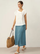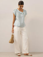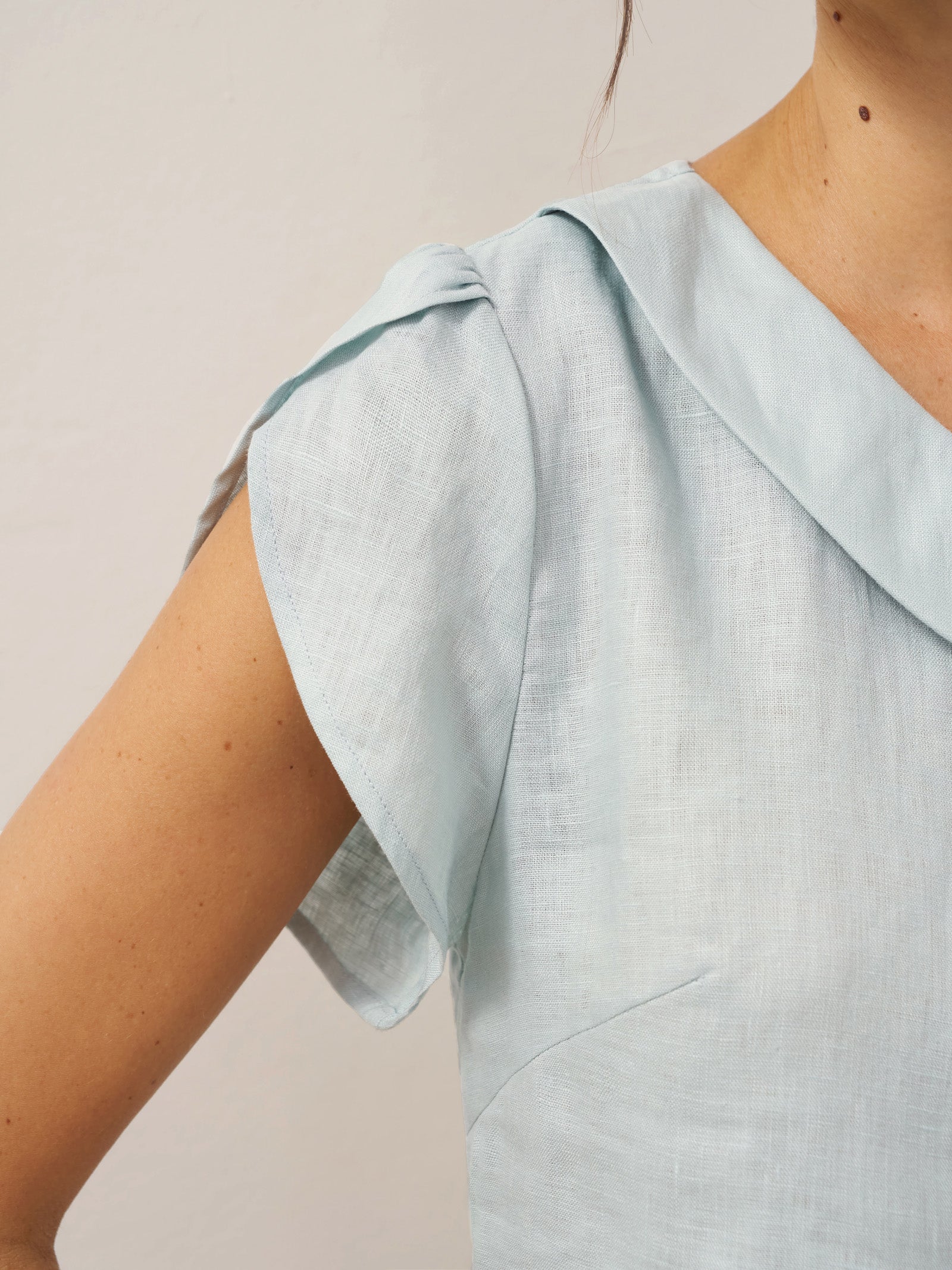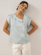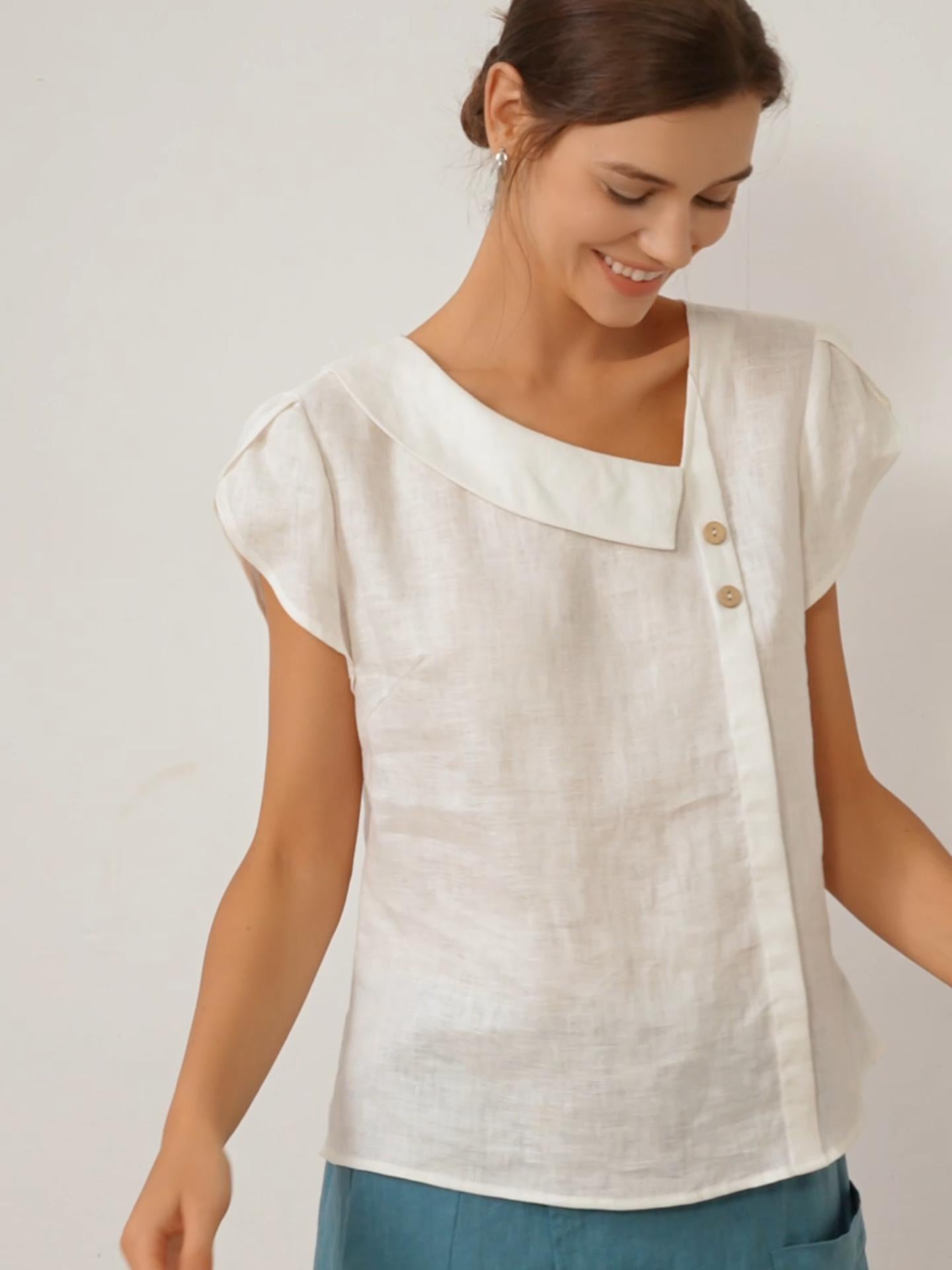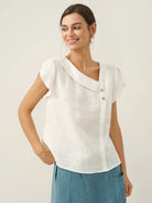 100% Linen Crescent Collar Flutter Sleeve Top FARA