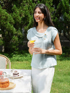 The Half-Moon Collar Flutter Sleeve Top blends celestial-inspired elegance with contemporary design, offering a perfect balance of structure and soft femininity.