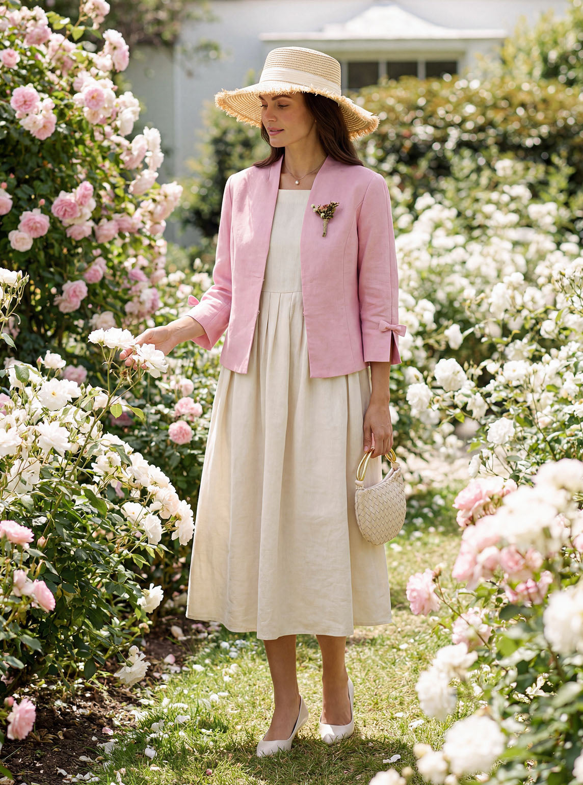 - Garden Soirée: Flowy midi dress + strappy sandals + woven clutch