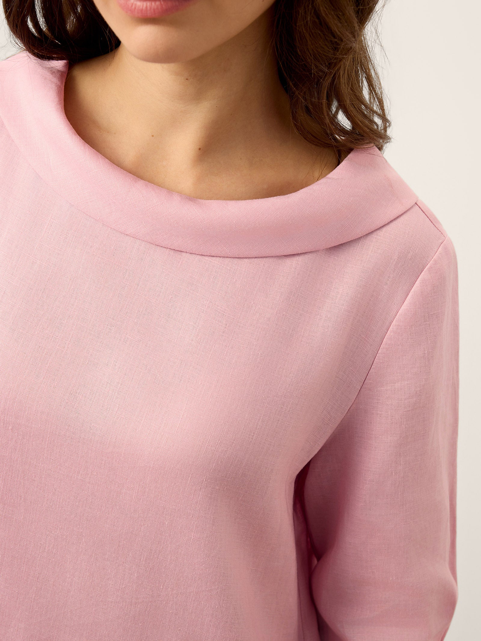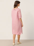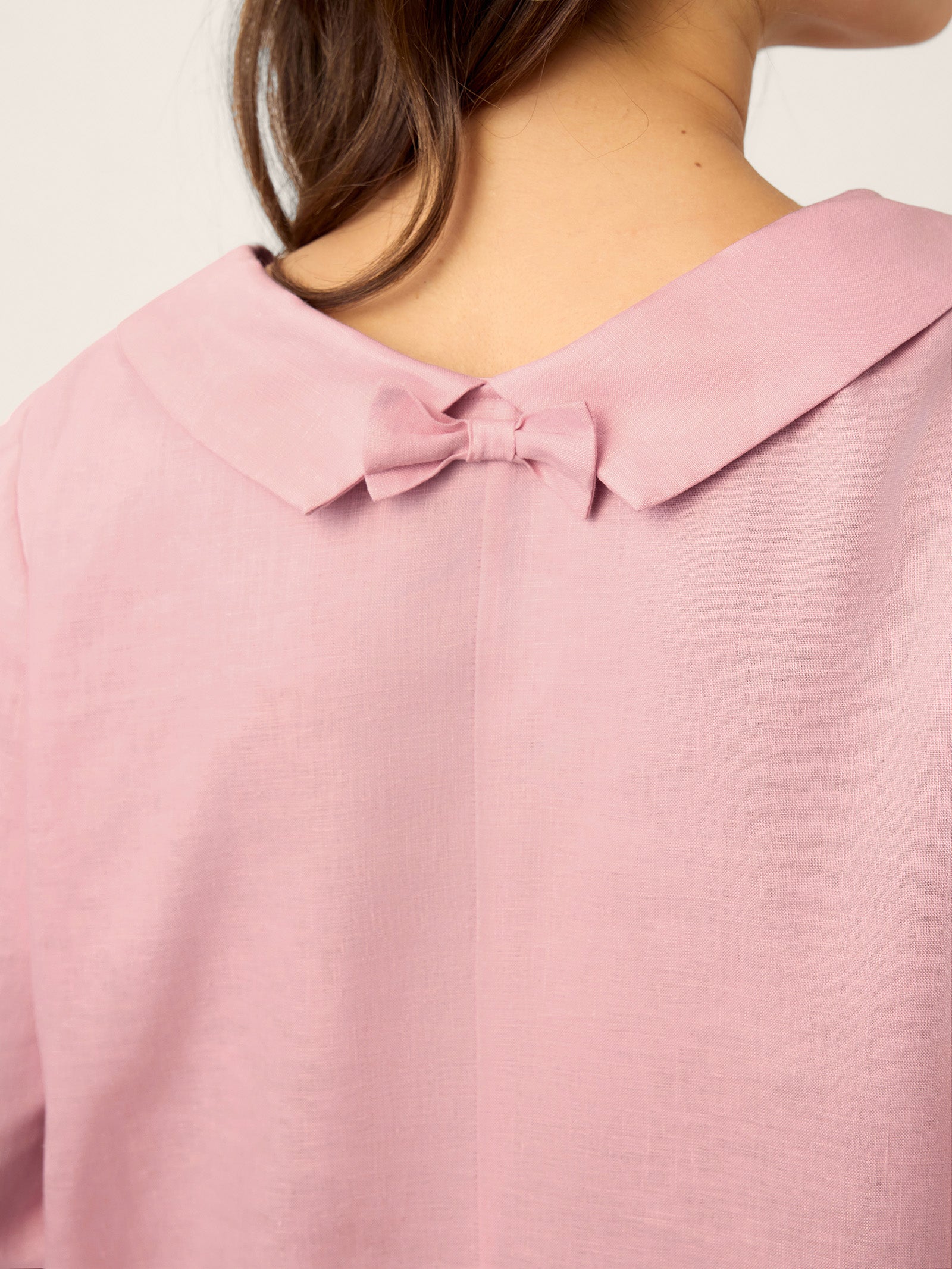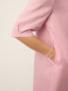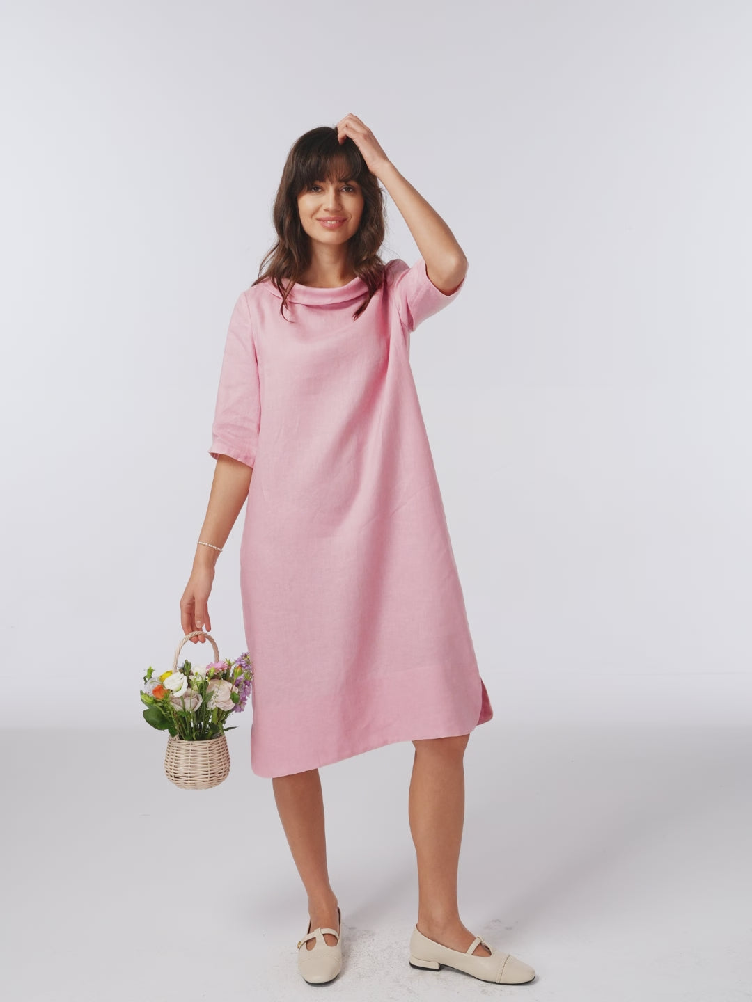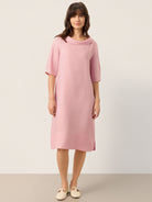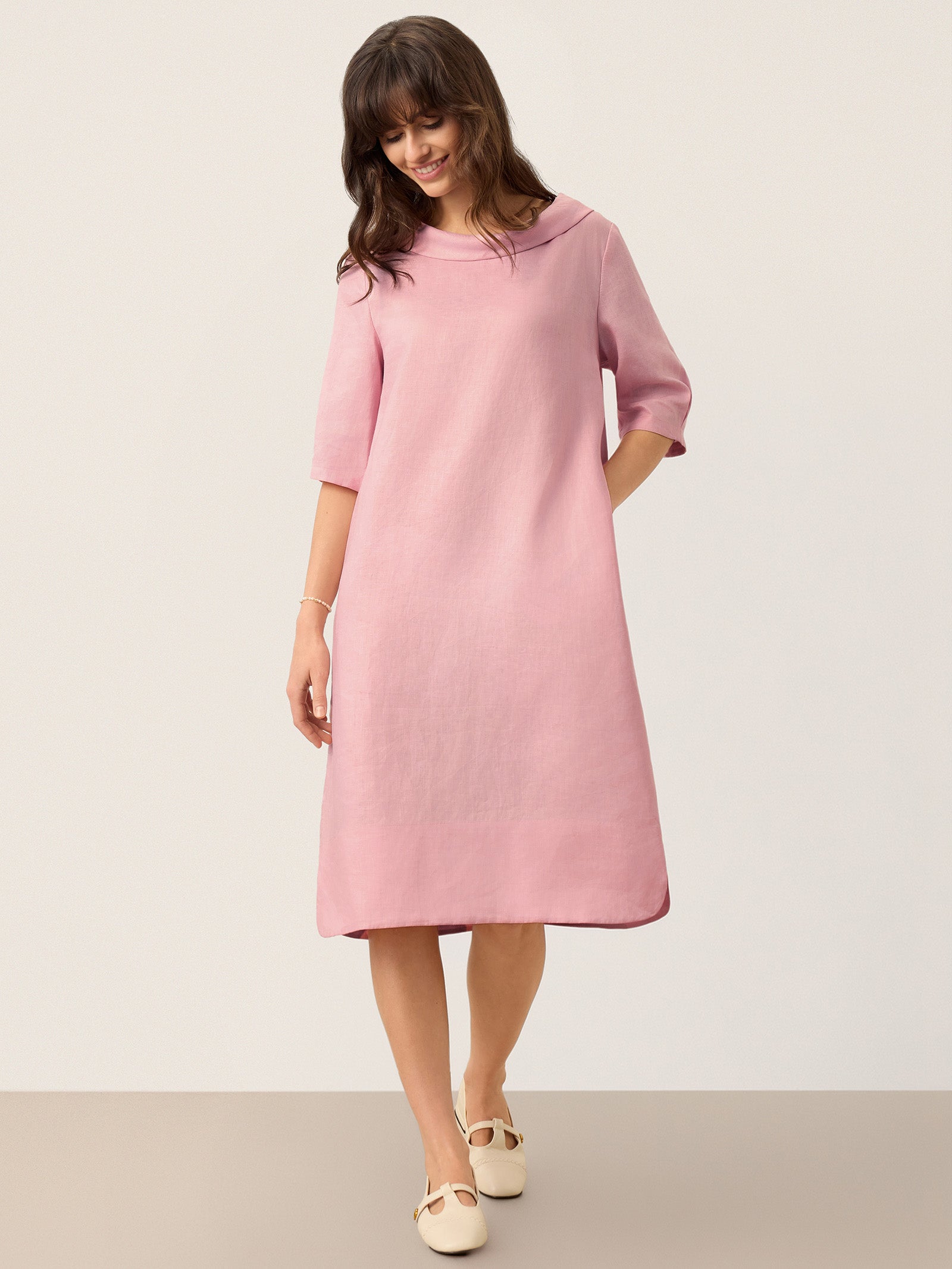 A soft pink midi dress with a sculpted boat collar and delicate bow-back detail, blending feminine charm with modern minimalism—ideal for spring and summer.