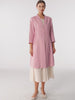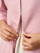 The AZURA long linen top features a V-neck longline silhouette with a defined waist, mid-length sleeves, and minimalist front closure, crafted in breathable 100% linen for a clean, flattering, and versatile fit.