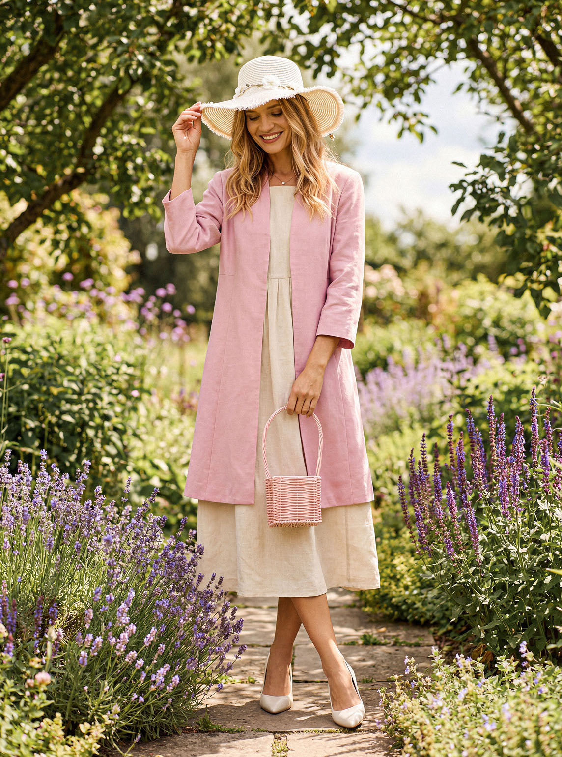 • Weekend Casual: White denim + flat sandals + straw hat