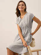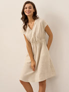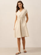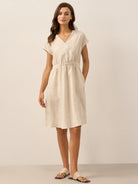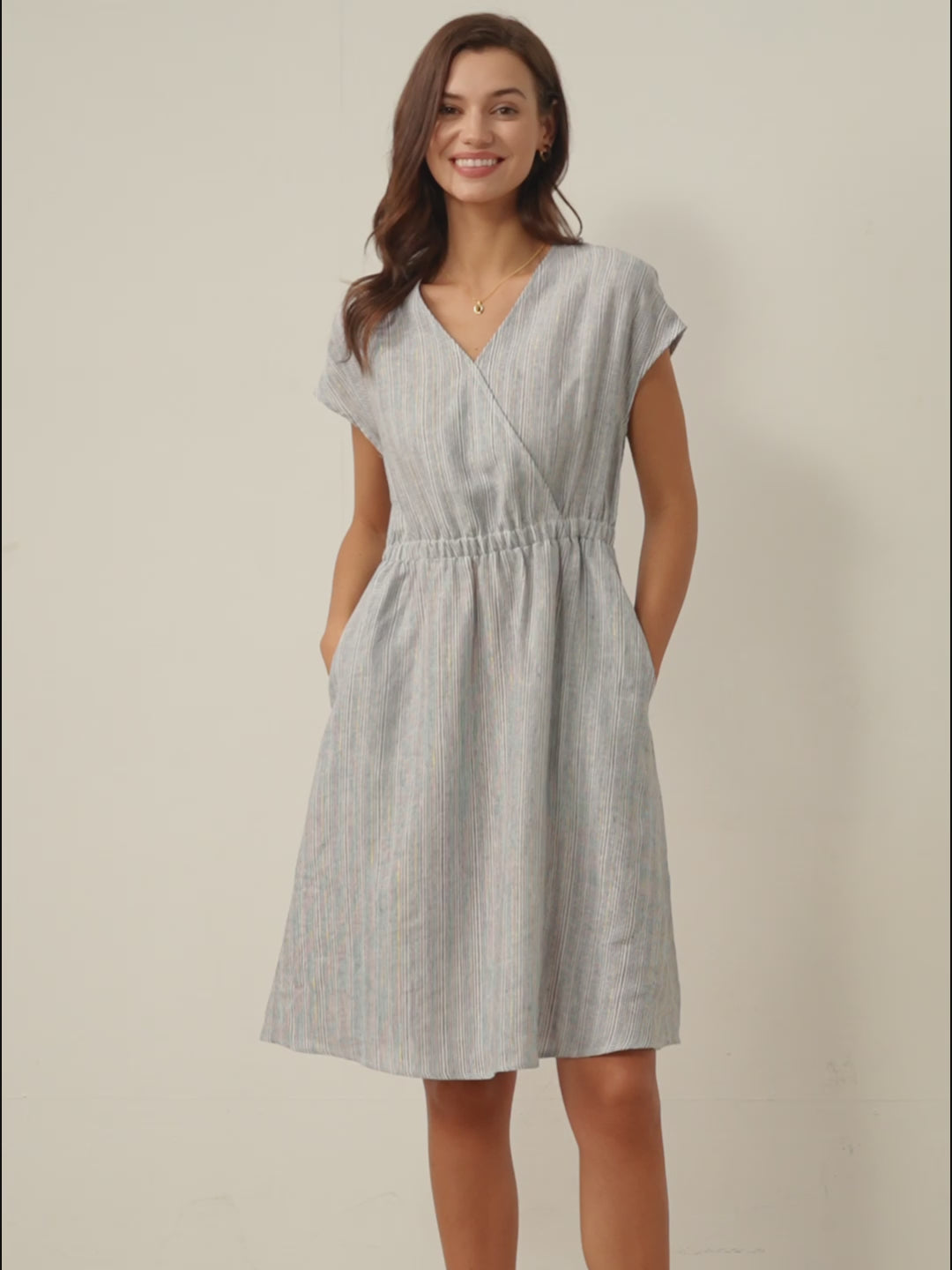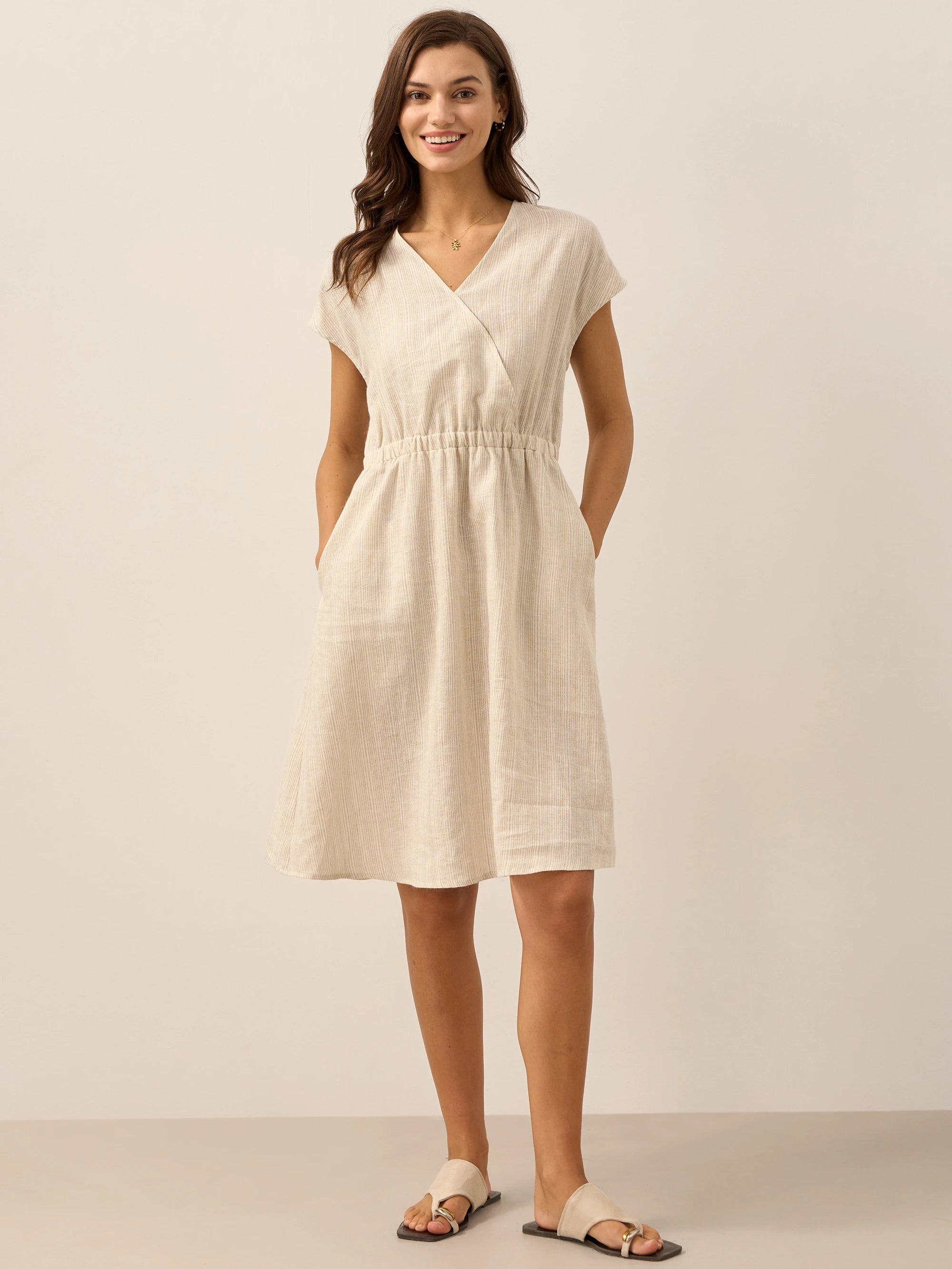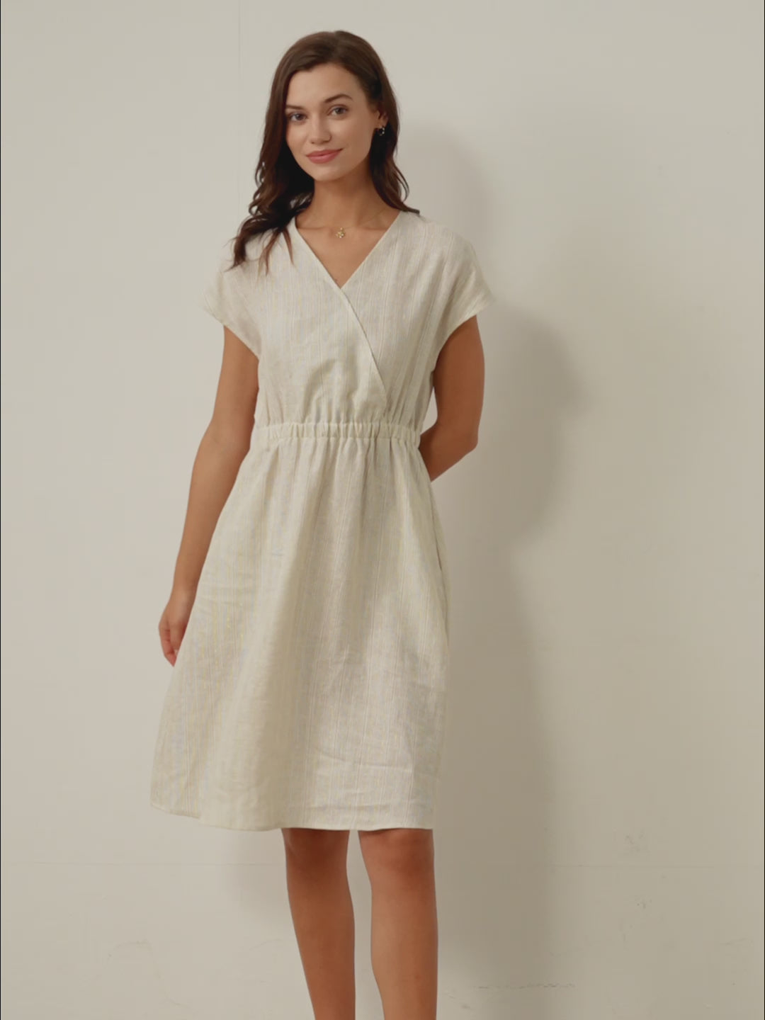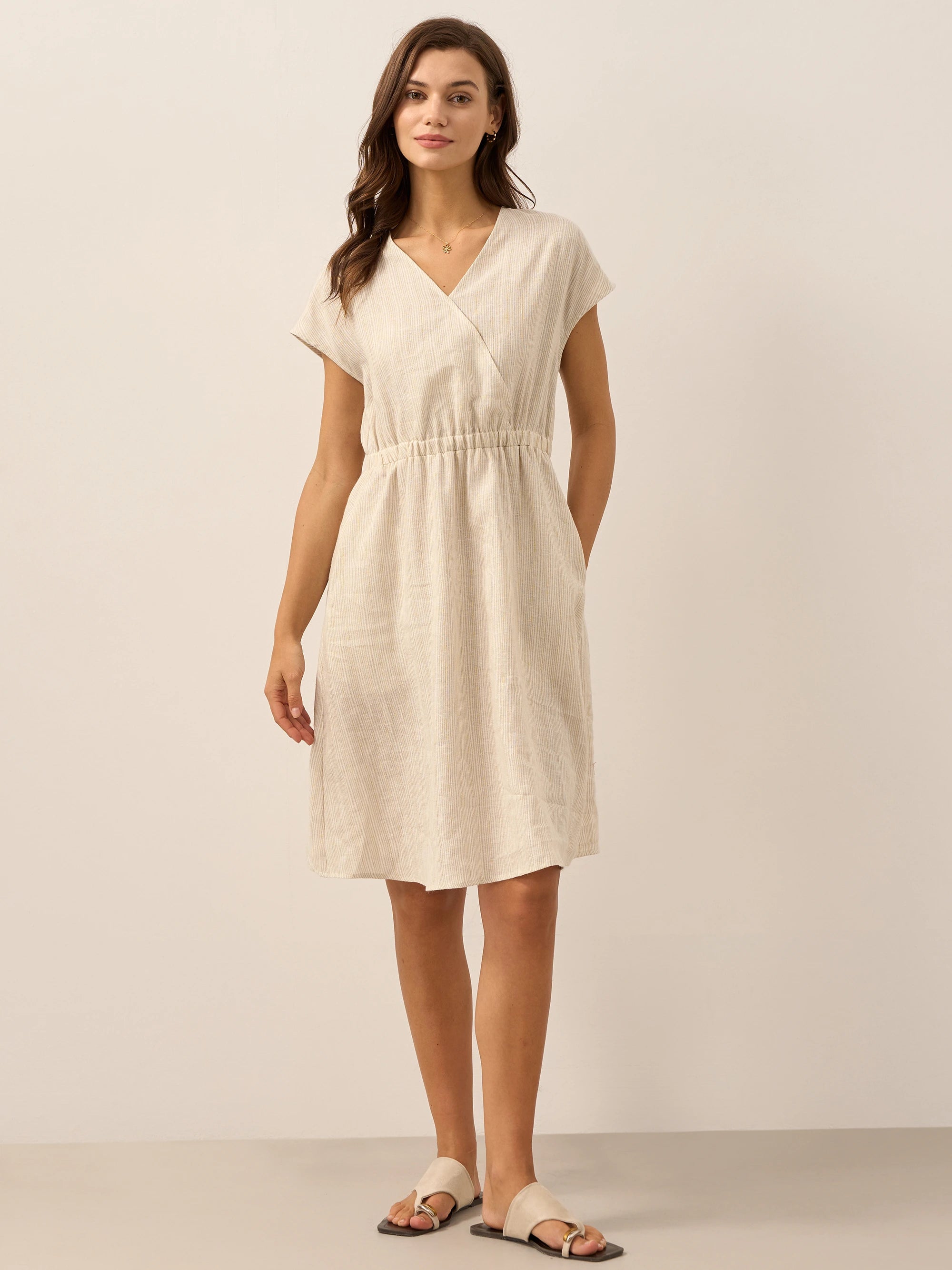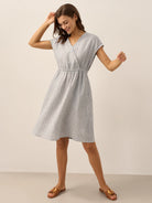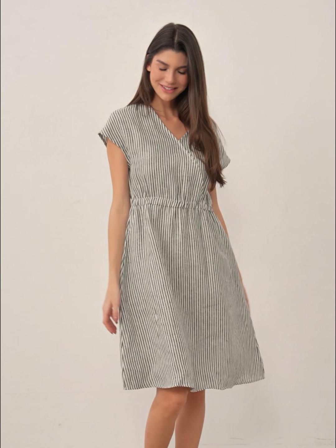 100% Linen Striped Elastic-Waist Midi Dress ARIA