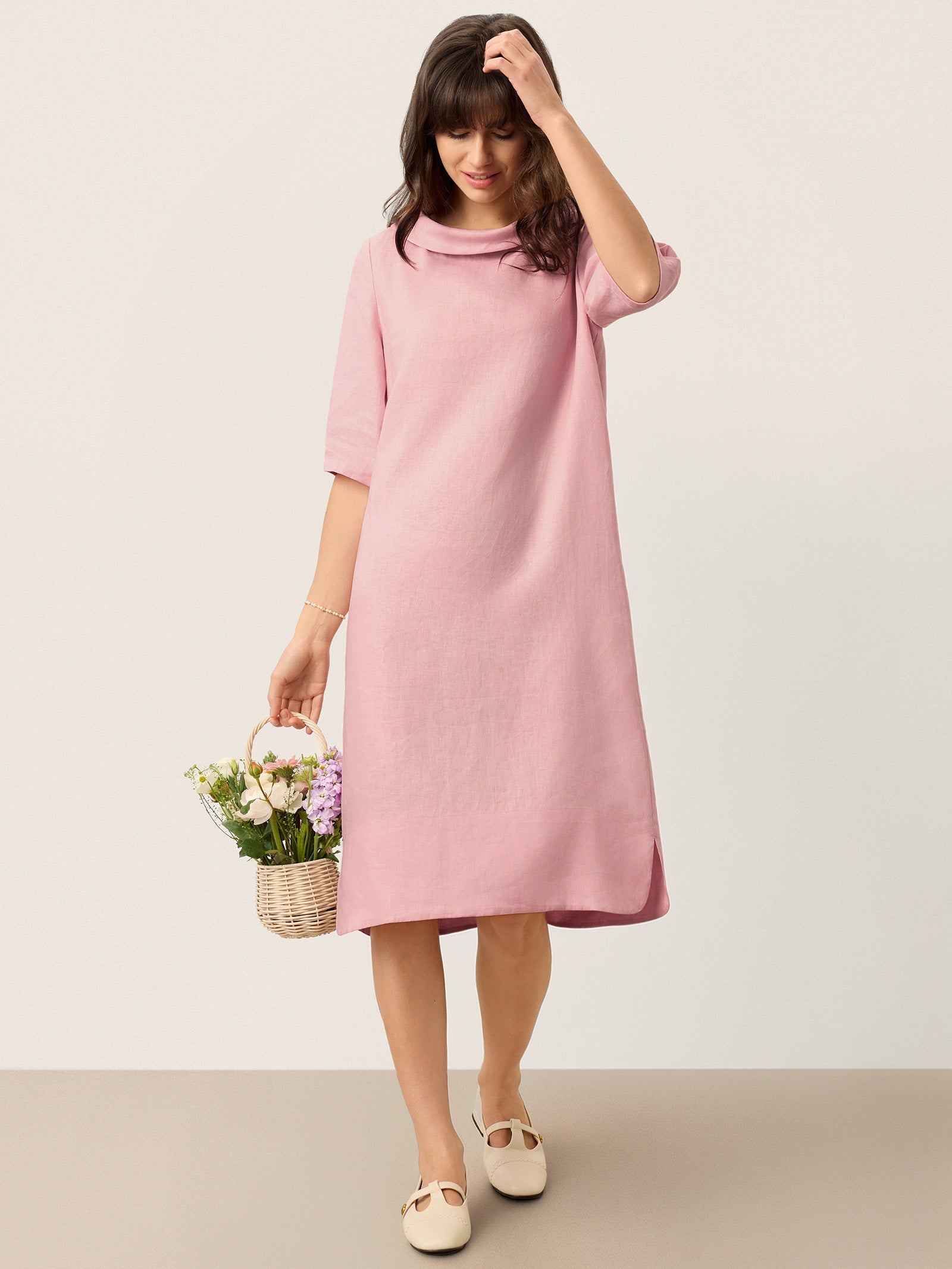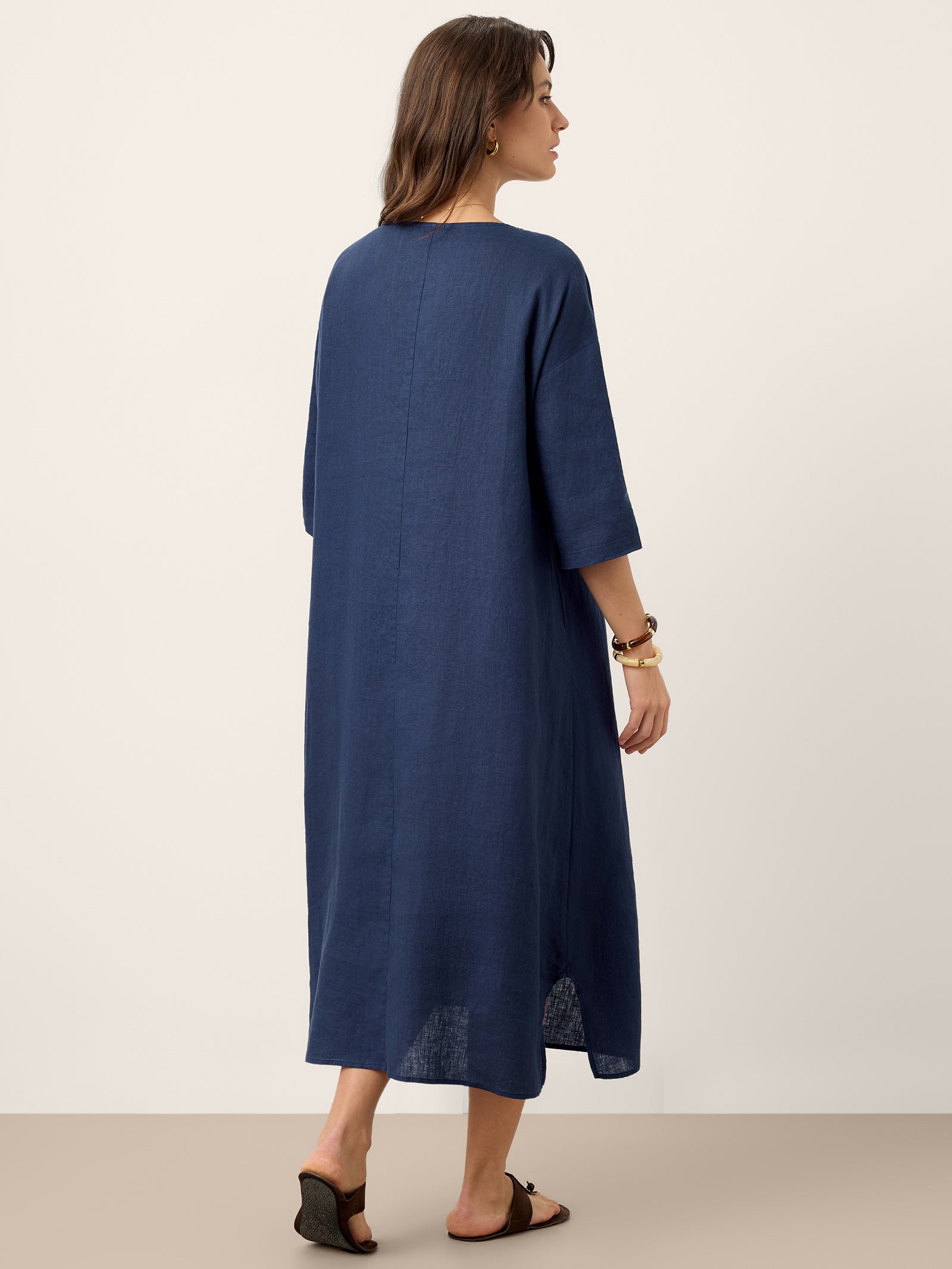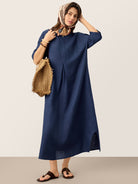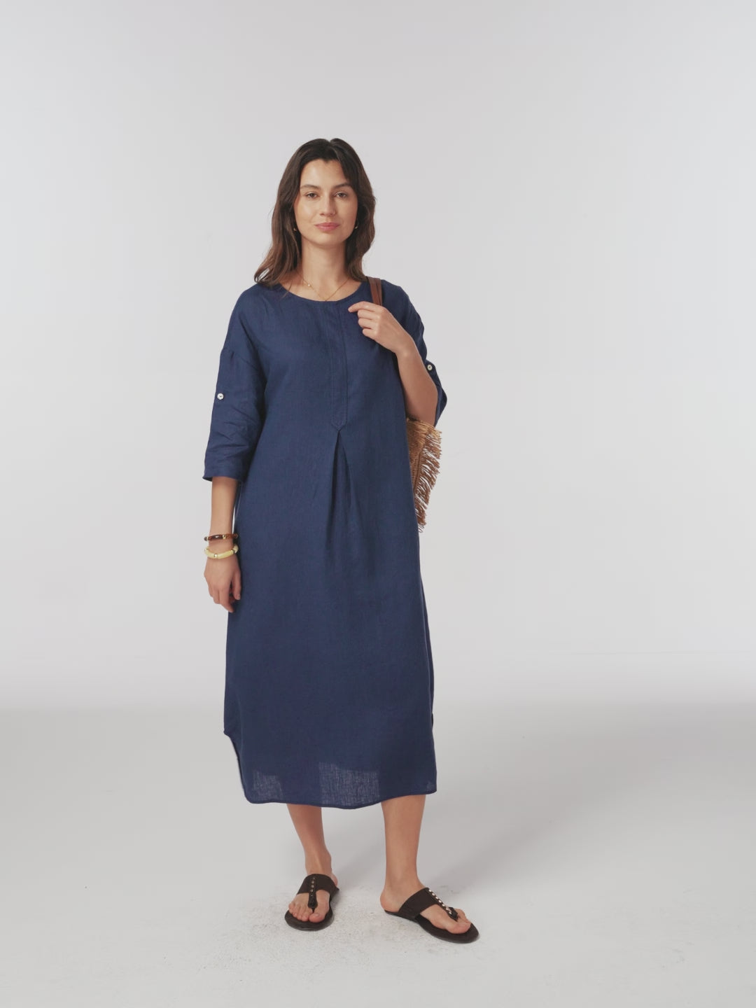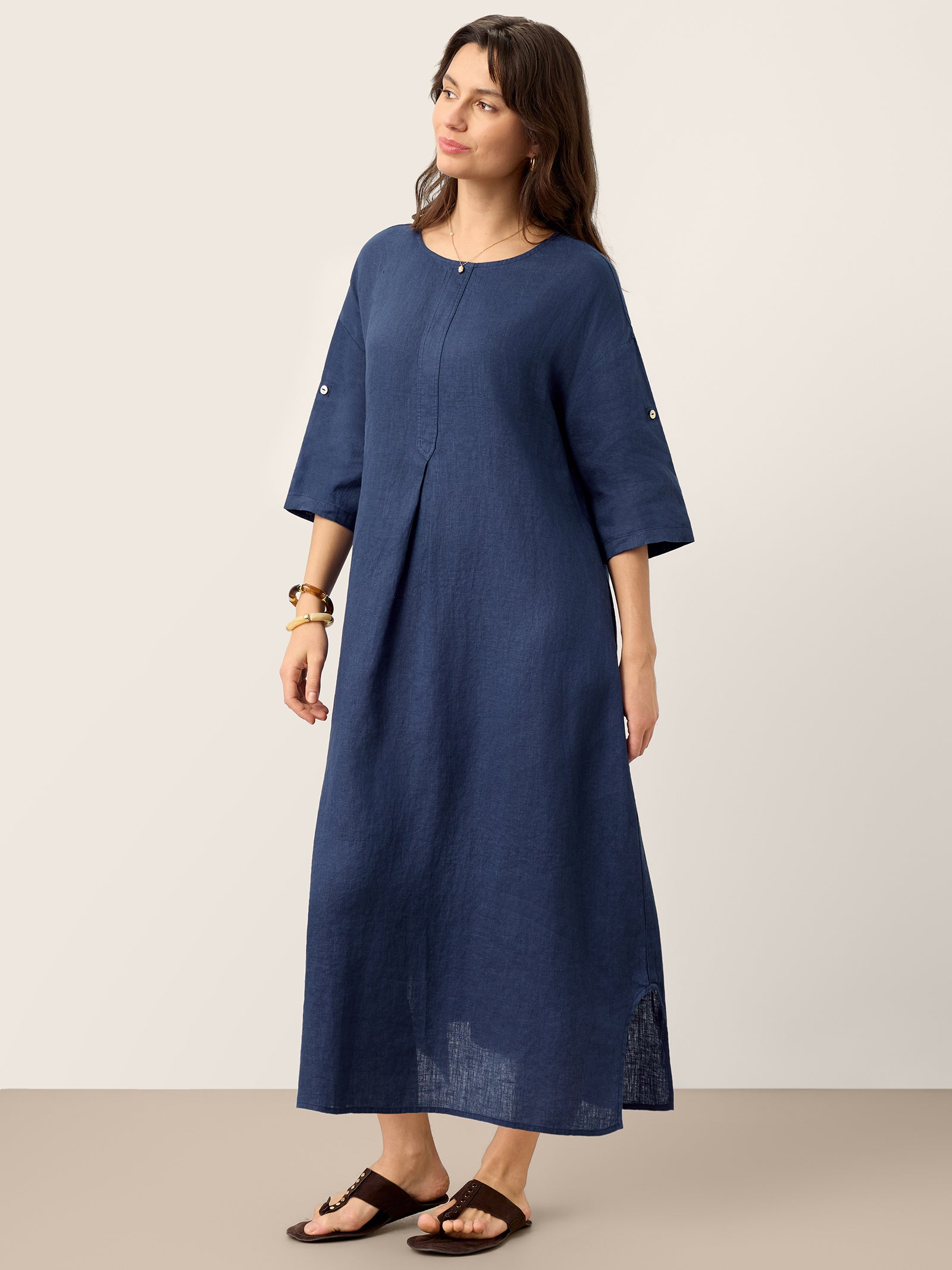100% Linen Roll-Up Sleeve Inverted Pleat Maxi Dress MARIBEL