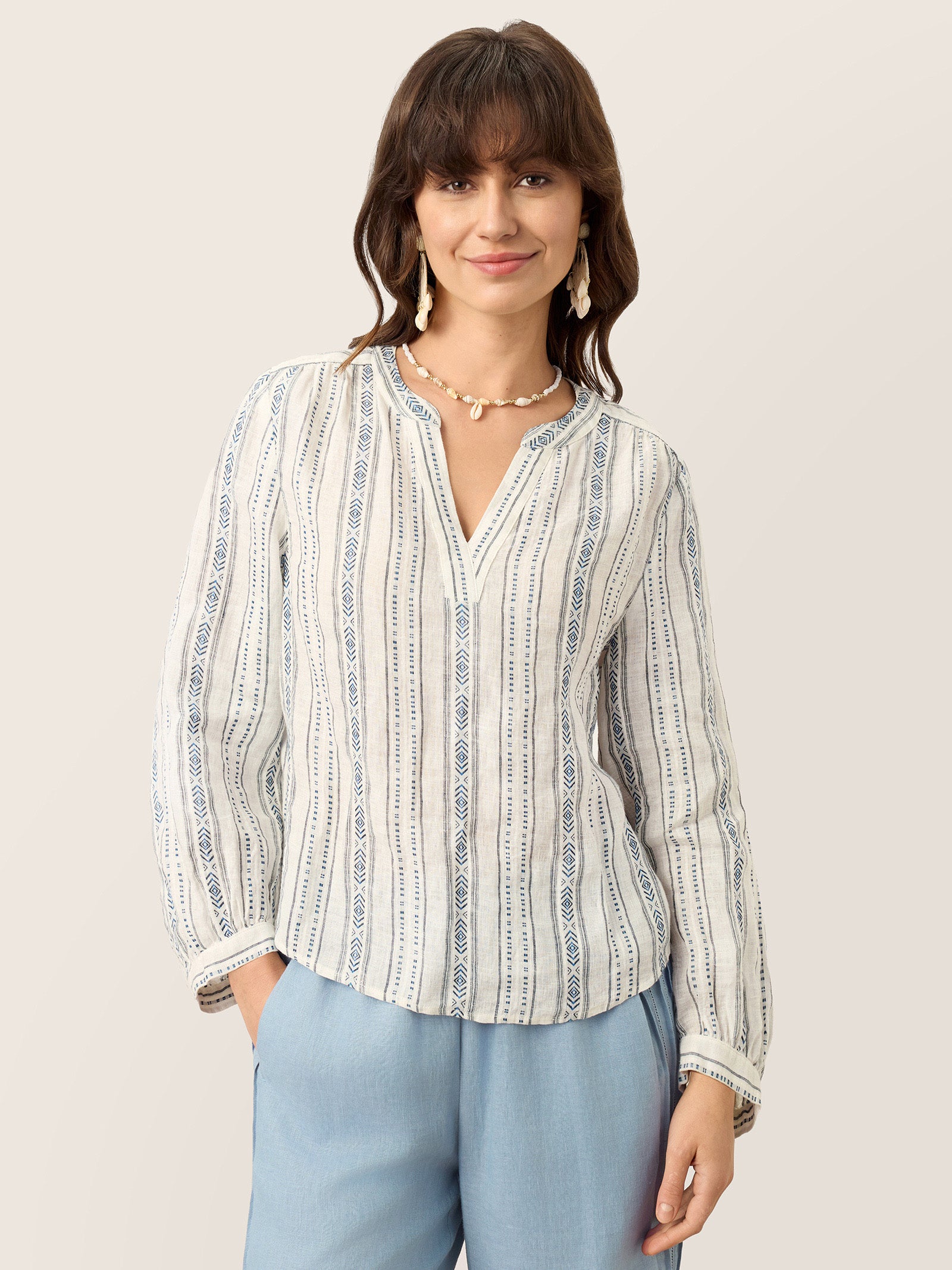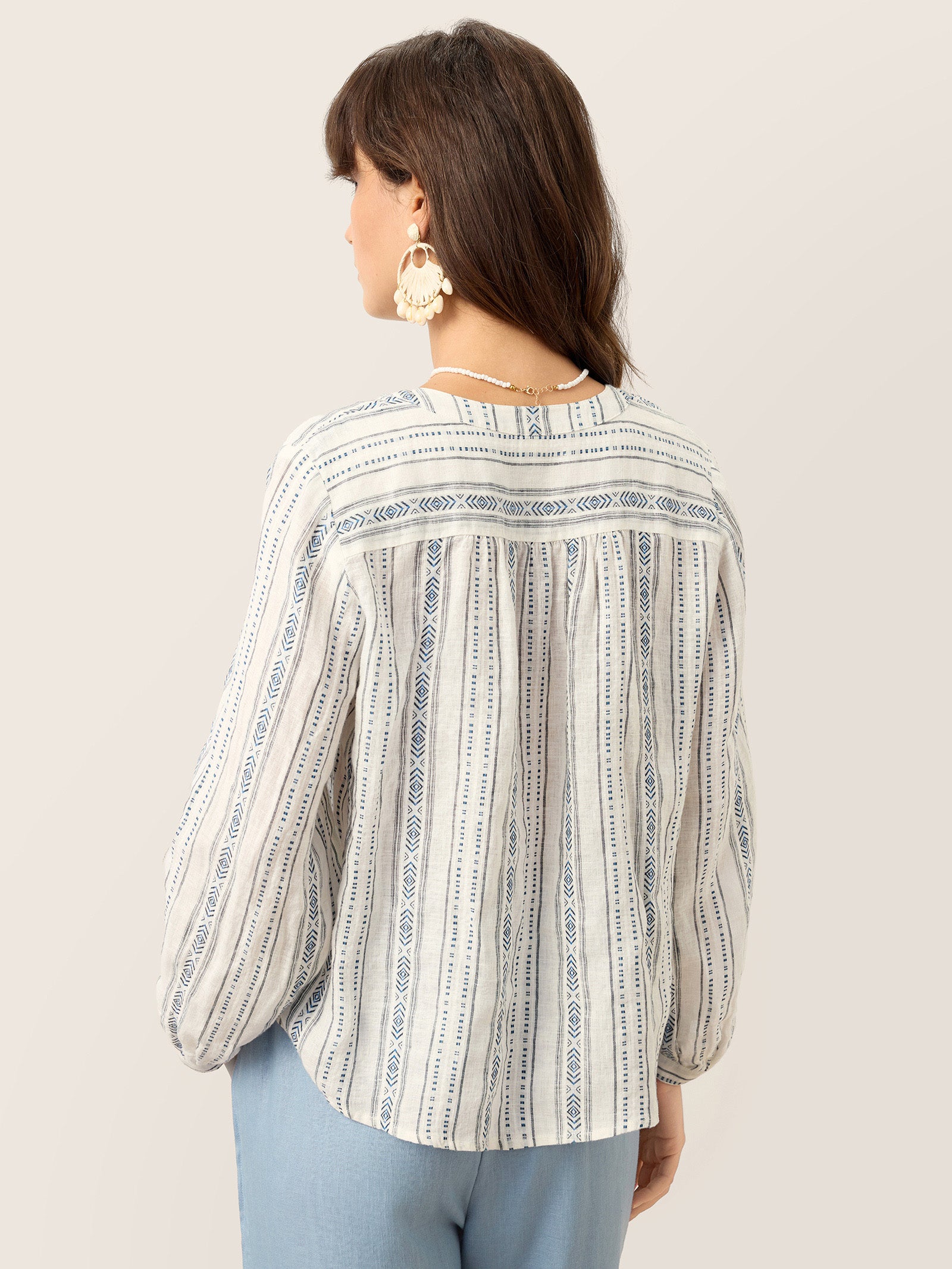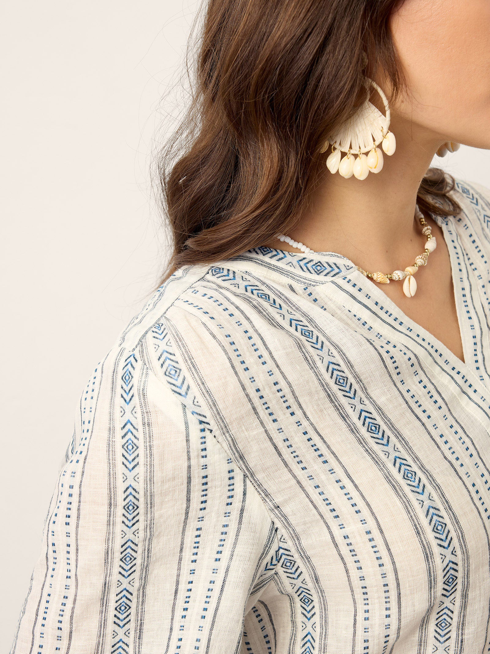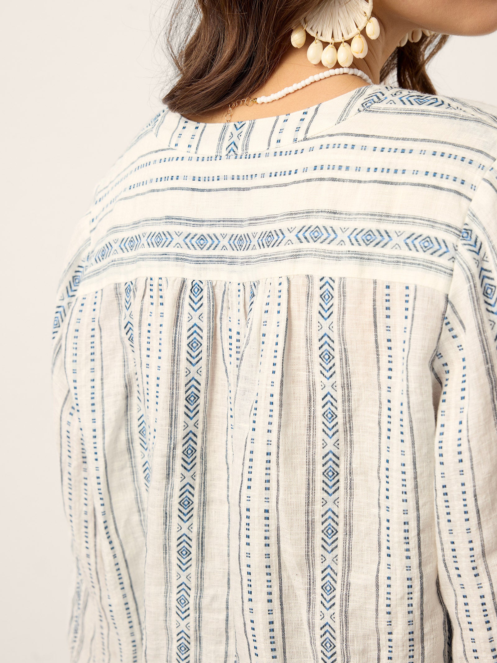 Linen Tribal Stripe Split Neck Bohemian Blouse KERENZA