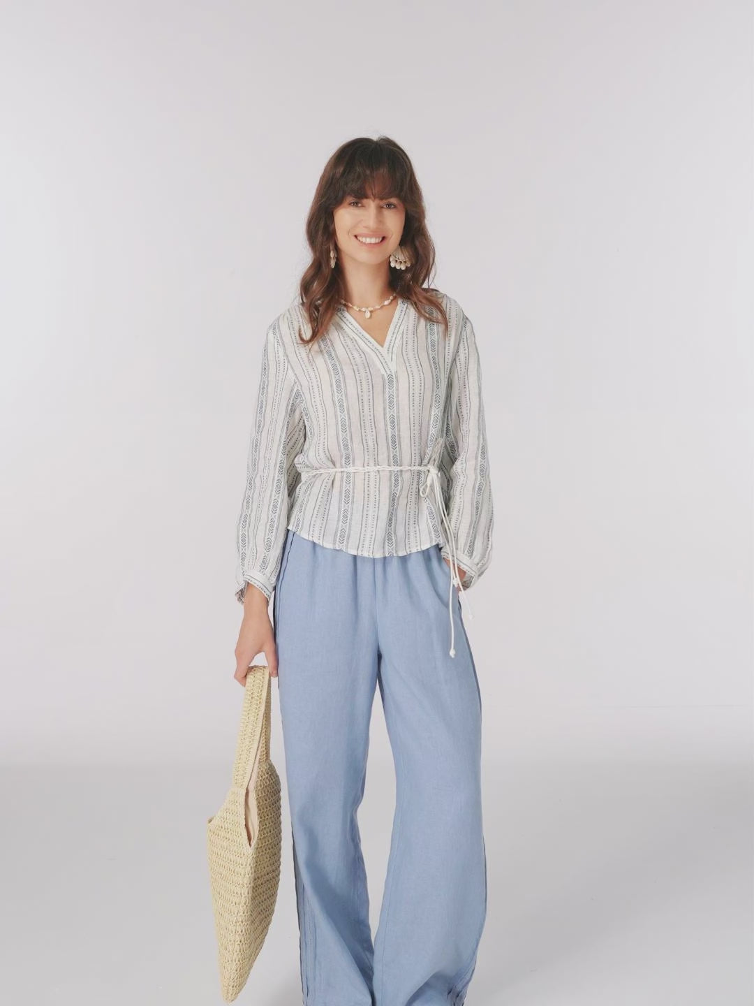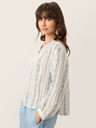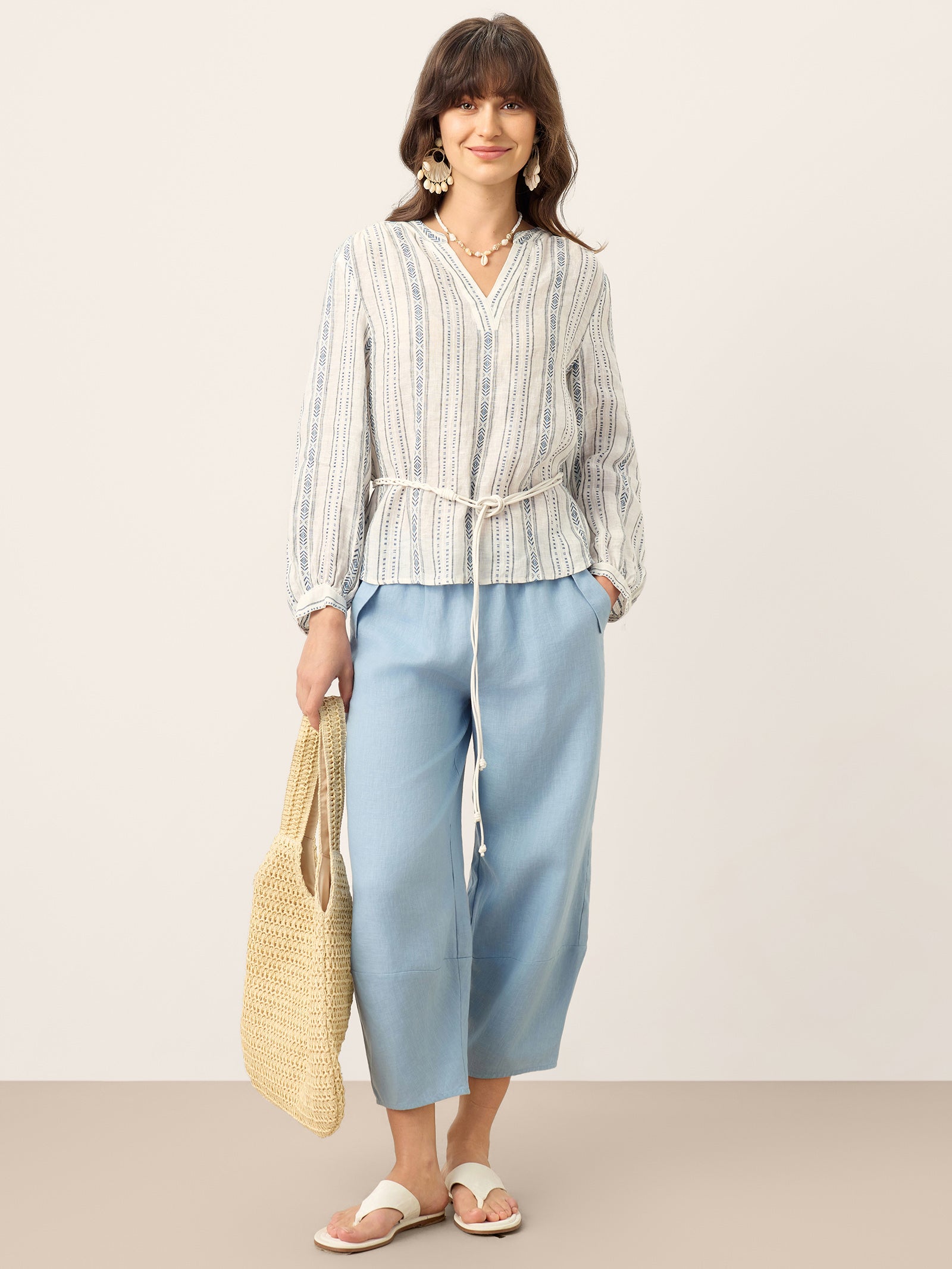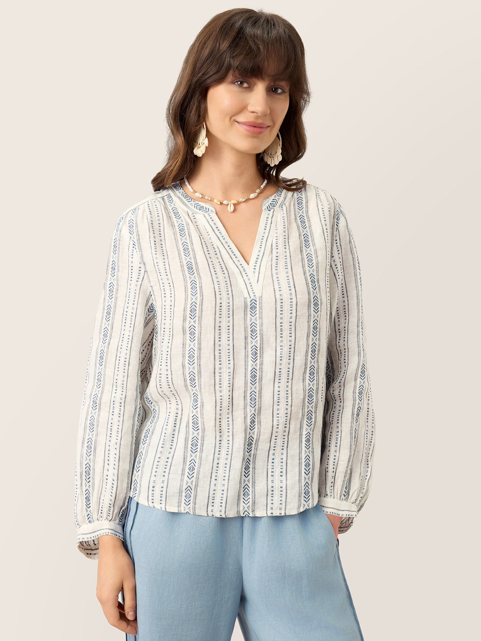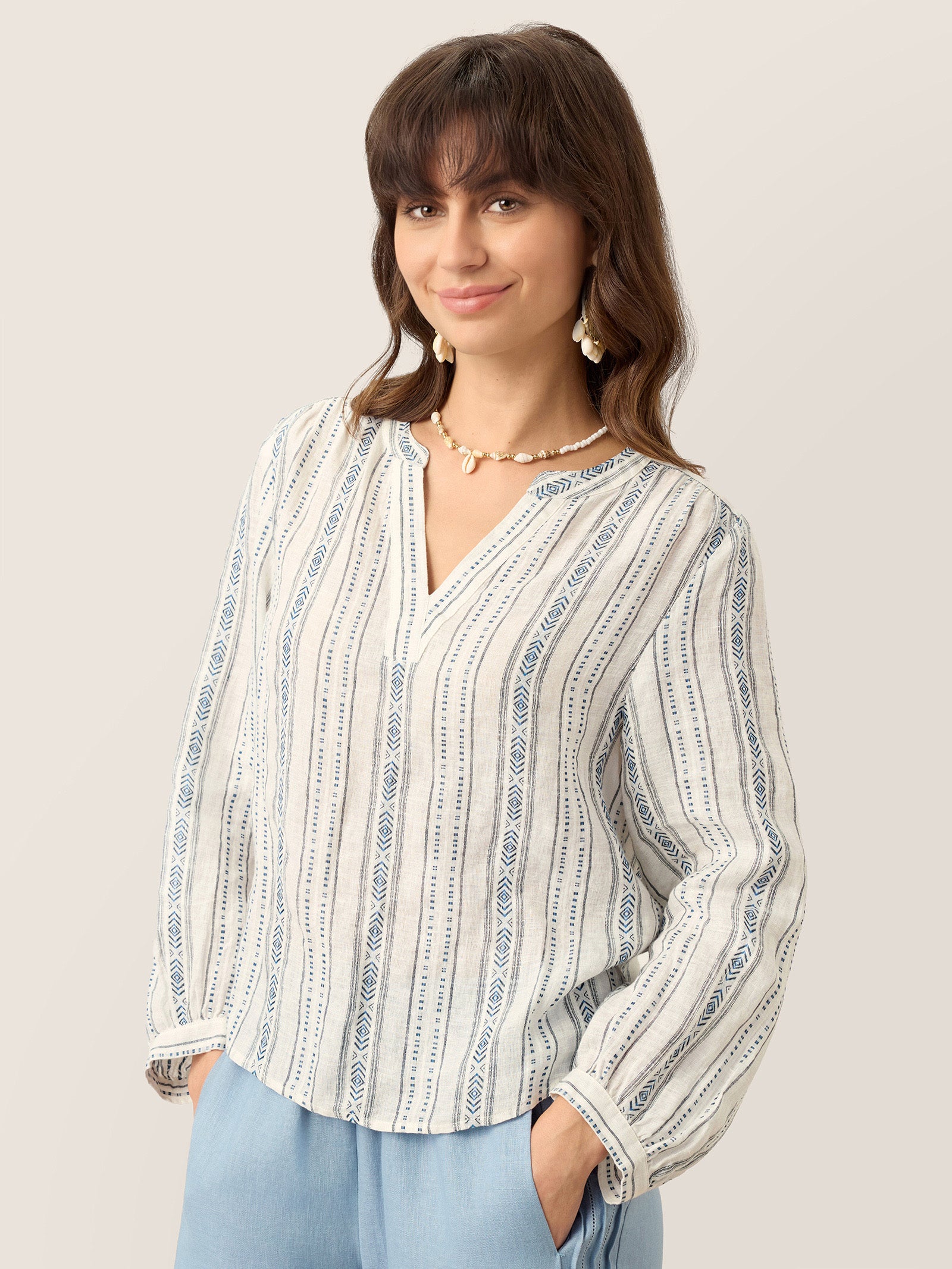 Linen Tribal Stripe Split Neck Bohemian Blouse KERENZA