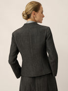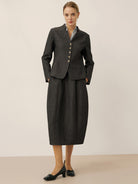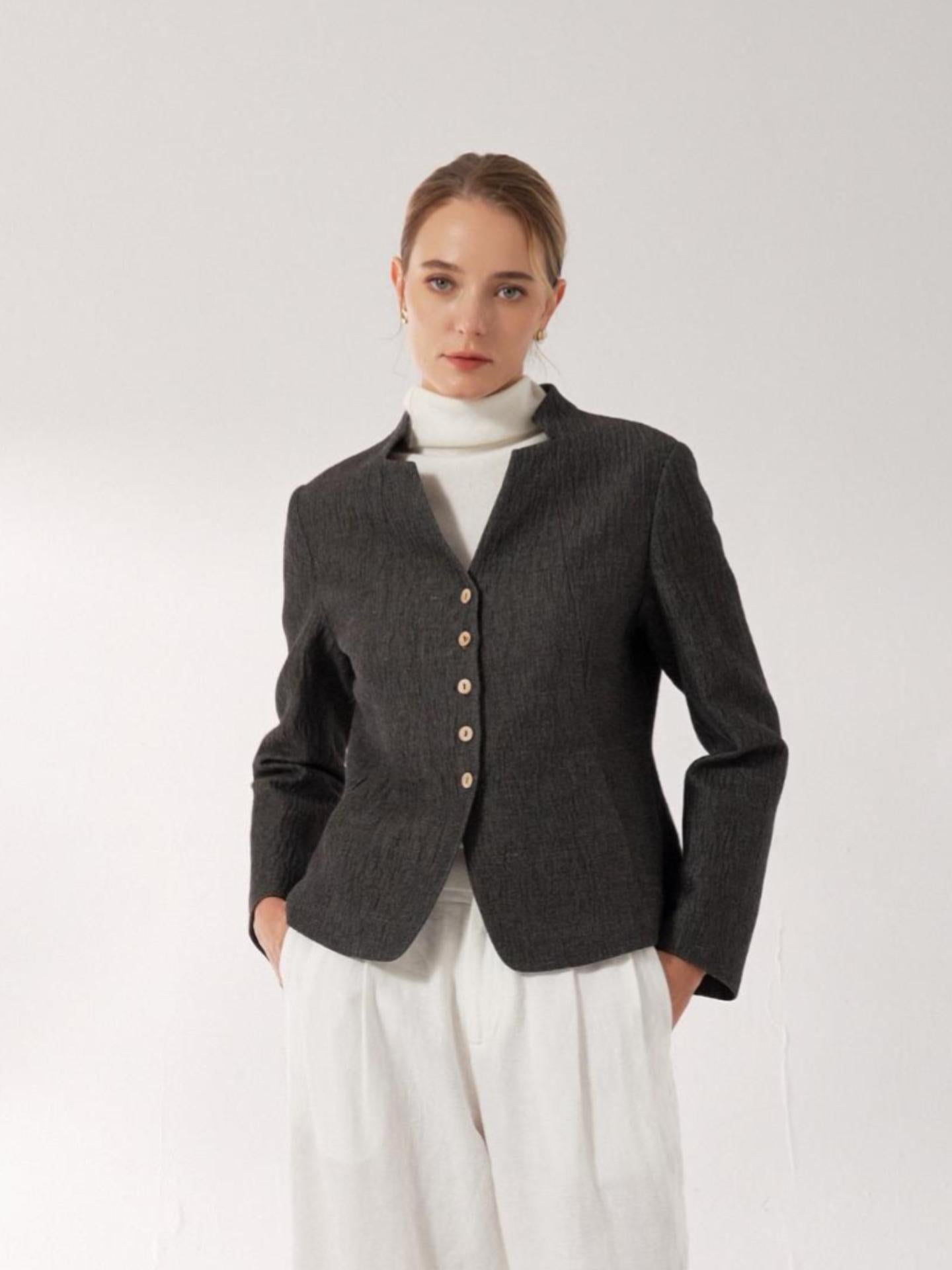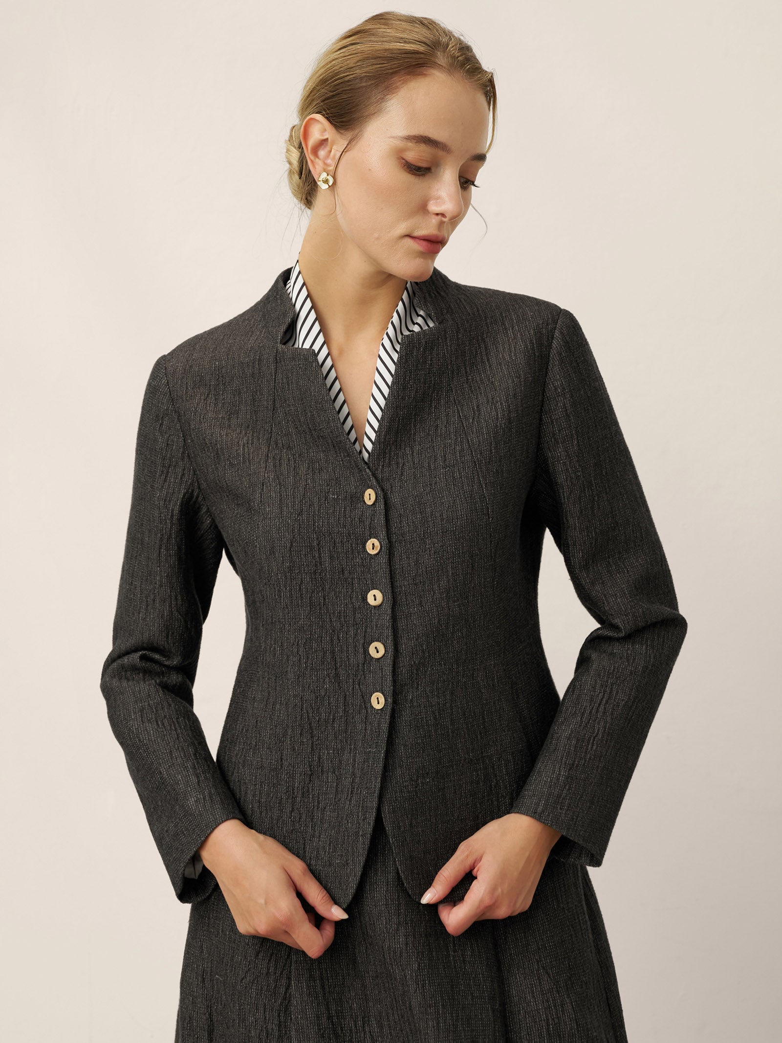 A linen shirt jacket featuring a mandarin collar with a star notched detail and tailored vertical seams, designed for a sleek silhouette in a smoky quartz color.
